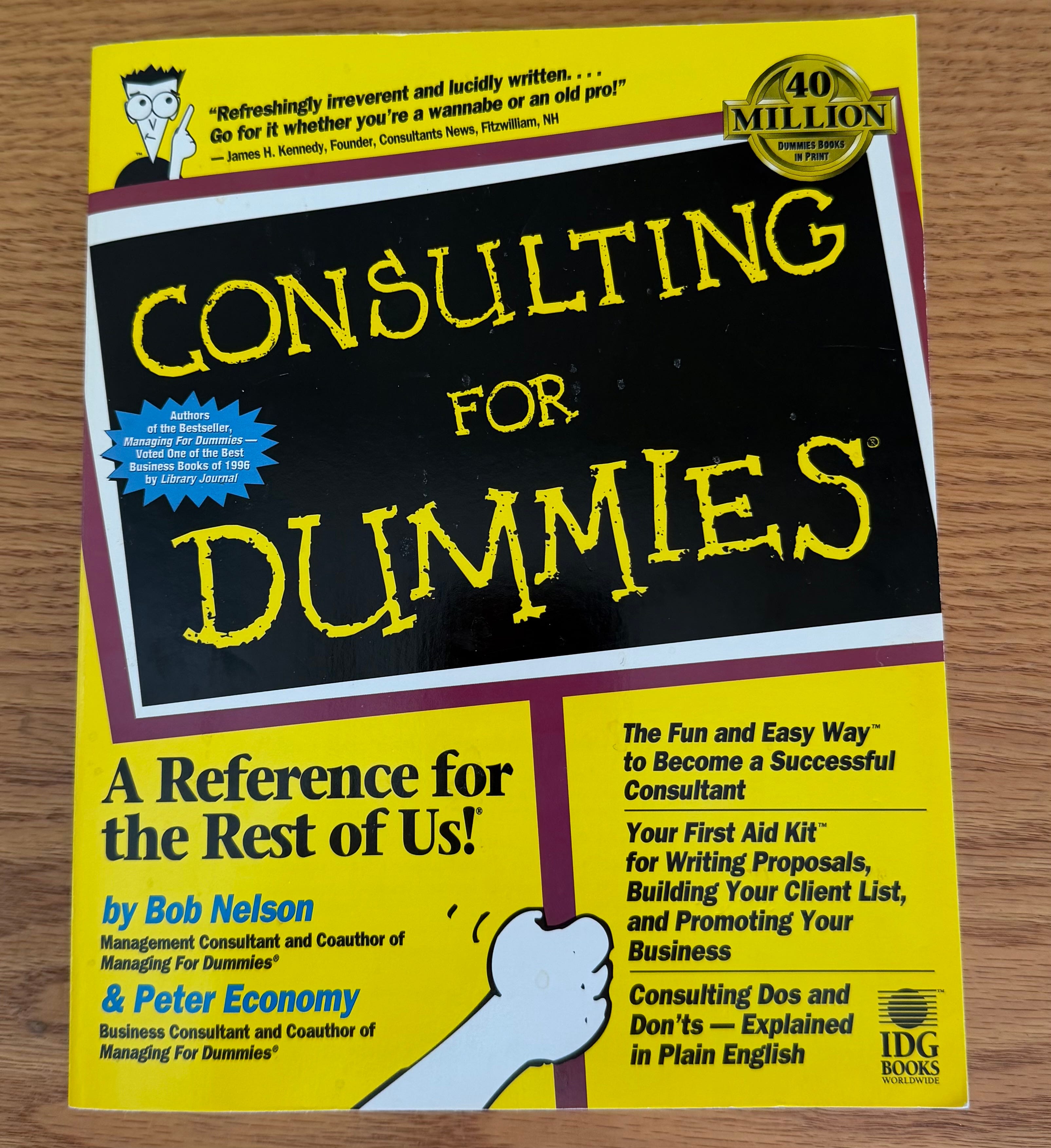 I grabbed the first book off the top of the pile. A bright yellow copy of Management Consulting for Dummies. An evergreen topic, I thought. Solid ground.